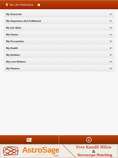 - Life predictions: It gives you reading for your character, happiness & fulfillment, lifestyle, career & occupation, health & disease, hobbies, love matters and finance. For more details, refer to image 3.