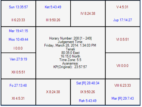 Here, the sub lord of the 6th house is Moon. She is in Ascendant posited in Rahu star and Saturn sub. Rahu is in 8th house, whereas Saturn is in 9th house in the star of Jupiter occupant of 5th house. Therefore, Moon is connected with 5, 8 and 9 houses at sub level. It is favorable for Australia. Moon will be in the star of Rahu and sub of Saturn/Mercury. It seems to me that stars are in favor of Australia. Good Luck all!!!