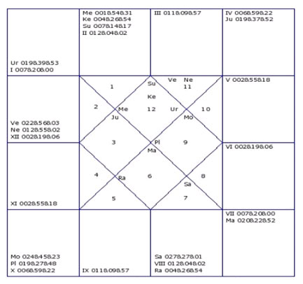 Here, the sub lord of sixth house is Venus. She is in 12th house in the star of Jupiter and the sub division of Saturn. Jupiter is occupant of fourth house whereas Saturn is placed in eighth house in the star of Jupiter again. Therefore, Venus is strongly connected with 4 and 8 houses at sub level. It is favorable for CSK.