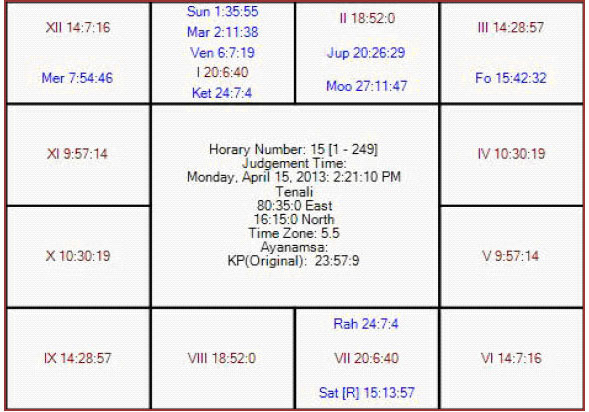 Here 6th and 11th sub lord is Jupiter; he is in Moon star and Kethu sub. Moon is in 2nd house and Kethu is in Venus star. Therefore Jupiter is connected with 2, 4, 12 houses. Hence it will offer negative results for PWI. It is interesting to note that Jupiter is also sub lord for 1 and 7 houses.