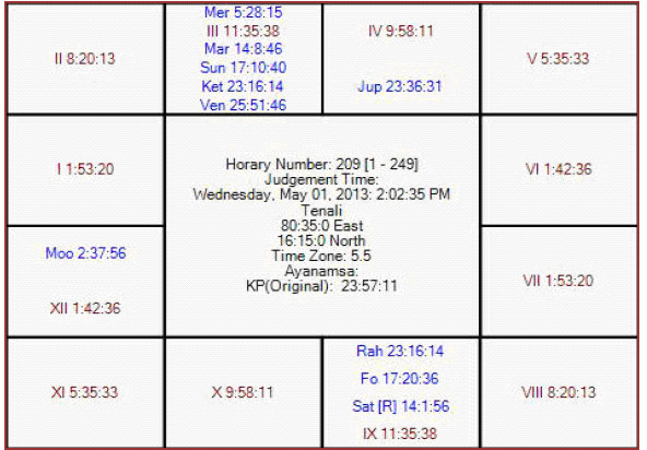 The following is the horary map for KP no 209 in favor of DD.
