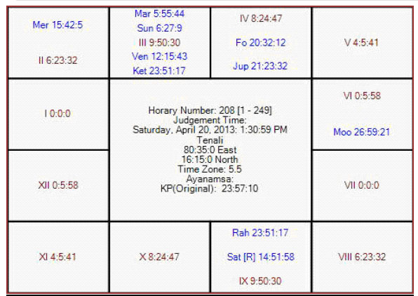 The following is the horary map for KP no 208 in favor of DD.