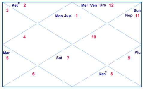 In the above chart Mercury is debilitated as it is occupying Pisces in twelfth house. Lets assume that this horoscope belongs to Mr. X. Now what can the probable results be of debilitated in this horoscope. First of all, Mercury owns third and sixth house in this horoscope. This person is likely to work much harder to gain results as compared to others as Mercury owns the third house. This person is also likely to have many enemies as mercury owns sixth house too. When mercury will experience debilitation in transit, these negative significations would get triggered in his life. This person is also likely to suffer on account of education as Mercury also happens to be the chief significator for education in Astrology.