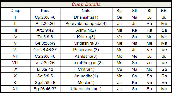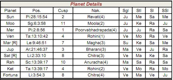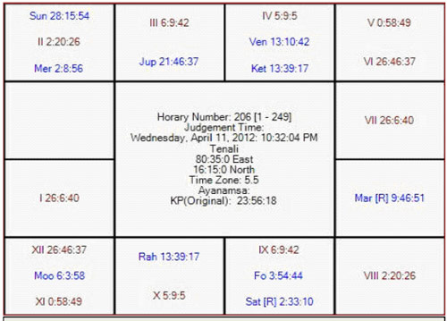 If we observe the transit in the last week of June-2012, Mars is transiting over the 8th cusp. Kethu will be in Sun star and Venus sub in exact conjunction with Jupiter in Taurus! Rahu will be in Saturn star and Venus sub, Mercury is in Jupiter star and Rahu sub in exact trine to its radical position. Saturn will transit in Mars star and own sub. Sun will transit in Mercury sign and Rahu star. All planets are transiting in the stars or subs of Significators for 8th house as well as ruling planets. Further there was a new moon day just three/four days before.