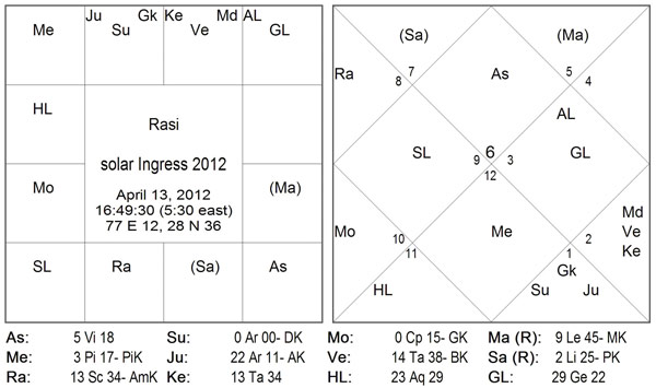 If we observe closely, the Asc in Solar Ingress Chart is very close to the 8th cusp of the horary chart! Further if we look at this map, Asc is hemmed between Saturn and Mars; Asc lord is debilitated and aspected by the 8th lord, the dis-positer lord for Mercury is Jupiter in 8th house along with 12th lord Sun and aspected by Saturn.