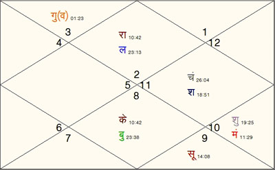 The Dasha of Ketu with Moon will affect him till March 2013 and it seems that his trouble won’t last till then. After that, ANTAR DASHA of Mars will have an effect on Kanda. Mars is exalted in Kanda’s chart and posited in 9th house, the house of luck. During that period he can calm down the things by using his power. Fate in that time may also favor him. Before that, he might get some support by performing the remedies of the planets Rahu, Ketu, Moon and Saturn.