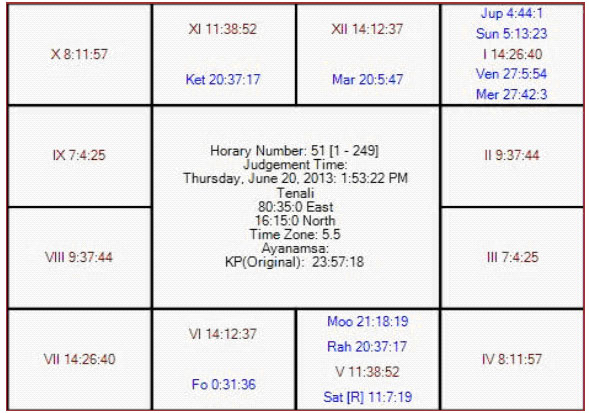 Here 6th sub lord is Rahu; he is in the star and sub. Jupiter is in 12th house in the star of Mars. Therefore Rahu is strongly connected with 12th house hence negative for India.
