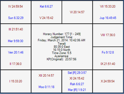 Here, the sub lord of the 6th house is Ketu. He is in 4th house posited in own star and Rahu sub. Therefore, Ketu is weak through star, but its sub lord Rahu is in 10th house along with Mars and posited in the star of Mars. Further, Rahu has to give the results of Saturn and Venus also. Both are connected with 11th house. Hence, the sub portion of Ketu is connected with 2, 7, 10, 11 and 12 houses. Match will be held at 7 PM during Saturn star and Saturn/Mercury subs. Saturn is strong through sub as he is connected with 3, 9 and 11 houses. Mercury is in 2nd house in Rahu star and Jupiter sub. Hence, there are strong indications for the win of India in this game. The retrograde impact of Mars and Saturn may cause own mistakes and misjudgments!