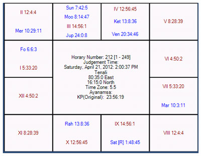 Horary number in favor of RR was taken as 212 and map of the heavens is as follows: