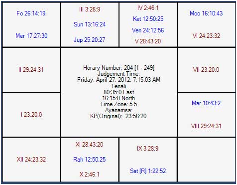 Horary number in favor of DD was taken as 204 and map of the heavens is as follows: