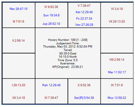 Horary number 188 in favor of PW was taken as and map of the heavens is as follows: