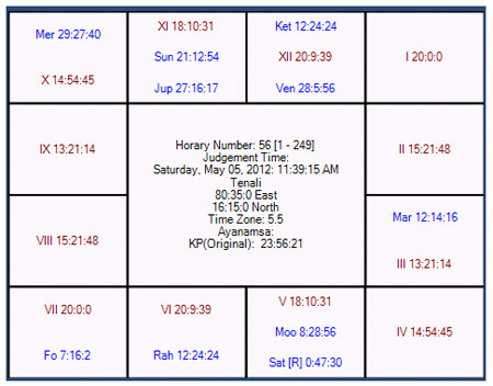Horary number in favor of RR was taken as 56 and map of the heavens is as follows: