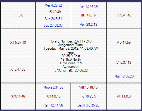 Lastly I verified the Asc and 7th sub lord Moon; she is in the star of Mercury and sub of Mars. The later is in the star of Kethu connected with 2nd house.