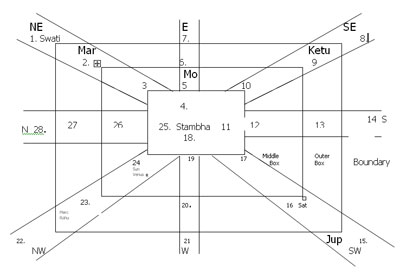 Kota Chakra has three square/rectangular boxes one placed inside other. It has also four entry routes for the transiting planets to get into the Chakra and four exit routes for the transiting planets to go out of the Chakra. The three-square/rectangular boxes can be termed as outer box (bigger one, which also act as boundary of the Chakra), middle box and the smaller box for the convenience of understanding. The smaller box is very sensitive area of Kota Chakra and called Stambha means pillar. Transiting planets with direct motion find their way into the Chakra through North East, South East, South West and North West corner routes of the Chakra and exit through East, West, North and South directions. Reverse is the case with retrograde planets like Rahu, Ketu for their entry and exit, respectively from the Chakra.