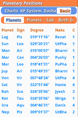 by amit999999999 (September 20, 2011) Awesome Software... liked flipping screen 1. add Khuller Ayanamsha 2.Shodasvarga-D1-D10 screen is not changing to South Chart. Liked RPs,South chart support,KP System added correct upto Sub lord..Dasa system is limited..Overalll this mobile software is superrb ..deserves 5 stars..I have compared with all mobile indian softwares...Thanks.. by Saisridhar (September 19, 2011) Great with limited system resources. Pl make the software work offline. That would be really great. My only support on palm os has come on Android too by shakti (September 19, 2011) Nice...