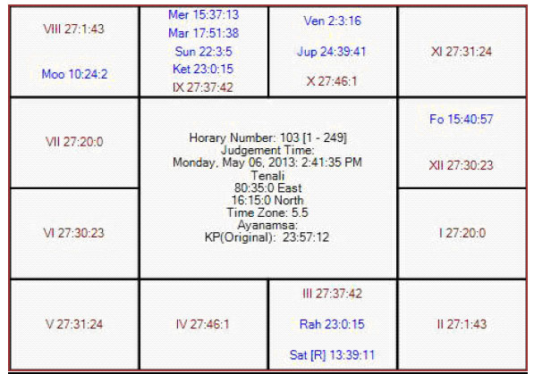 The following is the horary map for KP no 103 in favor of RCB.