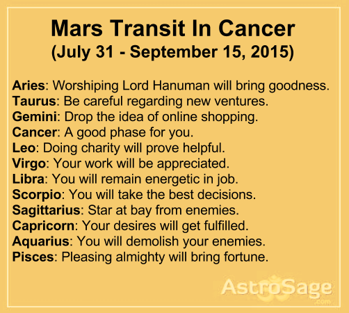 Mars will transit in Cancer on July 31, 2015 and it will remain like this till September 15, 2015. Want to know the effects on you? Read the expert predictions of astrologer “Acharya Raman”.