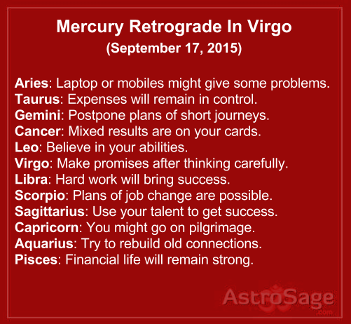 Mercury is getting retrograde in Virgo on September 17 and it will remain there till October 9, 2015. Mercury transit will produce some considerable impacts on your zodiac sign. But, what kind of impacts these could be? Read with the exclusive predictions of our astrologers.