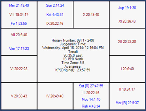 Here, sub Lord of sixth house is Ketu. It is placed in eighth house in own star but under the sub division of Moon. Ketu also represents Sun Lord of the ascendant. Moon is occupant of second house in the star of Rahu. Therefore, Ketu is connected with second house at sub level. Even though Ketu is in eighth house, it will offer favorable results for KKR. Moon at the time of match will be in the sub division of Mars and later transits in the star and sub division of Jupiter. It seems to me that stars are in favor of KKR and it may be a tough battle. Good luck for both of the teams!