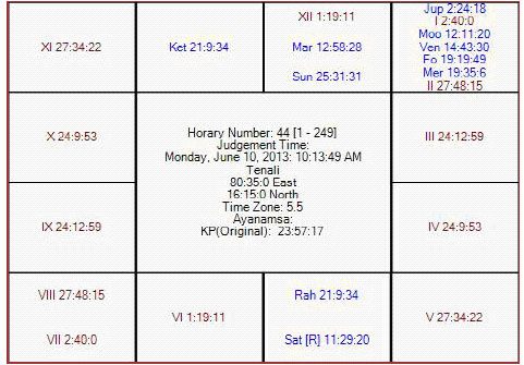 Here 6th sub lord is Mars; he is in the star of Moon and Rahu sub. Moon is in 1st house whereas Rahu is in 5th house in the star of Jupiter. Therefore Mars is strongly connected with 5 and 12 houses hence negative for RSA.