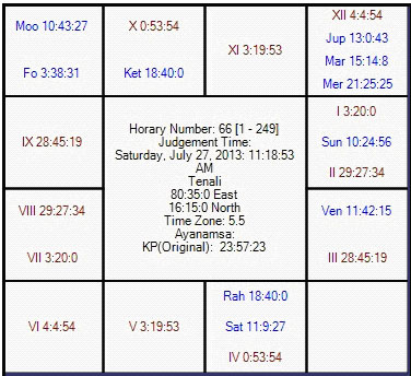 Here sub lord of 6th house is Moon. She is in 9th house in Saturn star and Sun sub. Saturn is in 4th house whereas sun is in Ascendant in Saturn star. Therefore Moon is strongly connected with 4th house. This is negative for WI. Further Moon will be in the star of Mercury during the match. It seems to me that stars are in favor of Pakistan. Good Luck to both teams.