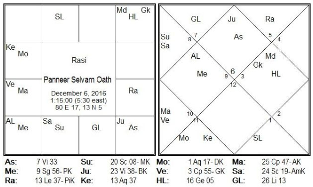 Mr.Panneer Selvam took oath as CM of Tamilnadu after the pathetic death of Puratchi thalaivi Jayalalitha. The following is the horoscope for the moment of his coronation: