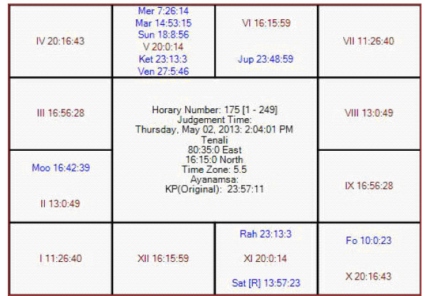 The following is the horary map for KP no 175 in favor of RCB.