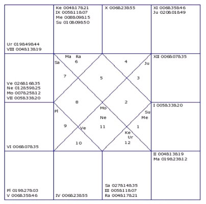 In this horoscope, the sub lord of 6th house is Mercury. It is in 9th house in the star of Ketu and subdivision of Jupiter. Ketu is occupant of the house whereas Jupiter is occupant of 11th house in his own star. Therefore, Mercury is week through star, but very strong through sub division. It is favorable for RCB.