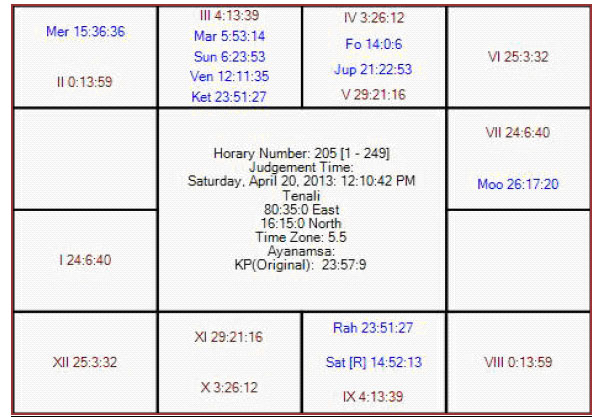 Here 6th sub lord is Mercury; he is in Saturn star and Jupiter sub. Saturn is in 9th house and Jupiter is in 4th house in Moon star. Therefore Saturn is strongly connected with 7-9 houses hence weak for RCB.
