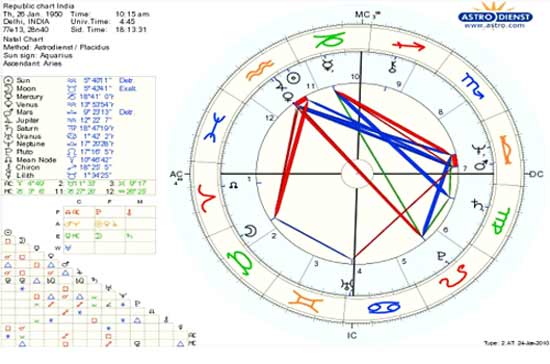 Uranus which is the lord of the 11th house and occupying gemini at the time of India becoming a republic state indicates the transformation and advances made in the rail and road network, telecomunication industry, public transport systems, breakthrough in scientific research, space researches in our country over the years. This uranus occupies pisces in the transit chart. It could indicate sudden and unexpected trouble / misfortunes in the above industries in the time to come. It so shows advances / research activities getting recognised in the field of medical science.