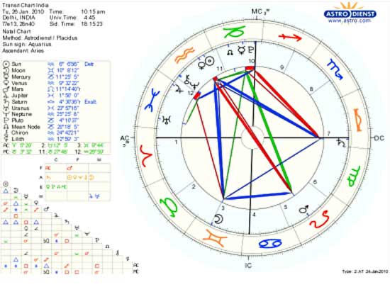 The Ascendant at the time of India becoming a Republic state was Aries. Its lord Mars occupying libra indicates the efforts put by our nation over the years in trying to build healthy relationships with other nations and build its image and its standing in the world. In the transit chart this Mars occupies the 5th house in leo which shows that apart from building its relations it is also going ahead with its independent policies and is beginning to stand up on its own. Mars in leo is strong which shows that we as a country are not ready to bow down to anybody in the world, even the superpowers. In the on going year the strength of our country will be known and accepted by other countries and perhaps the superpower nations will acknowledge this and give us a permanent seat in the UN.