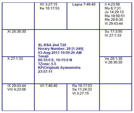 Here sub lord of the 6th house is Venus. She is in 4th house in own star and Rahu sub. Rahu is in 6th house in own star. Hence Venus is strongly connected with 6th house. This is positive for RSA. Moon will be transiting in Jupiter star. If we judge Jupiter, he is strong significator for 4-12 houses at sub level! Actually this signification will be unfavorable for RSA. Then I found that Jupiter is in Rahu star and on the other hand Moon will traverse under the sub division of Saturn in Jupiter star. Saturn is strong significator for 6-10-11 houses. As per these astrological pointers it seems to me stars are in favor of RSA. Good Luck to both the teams.
