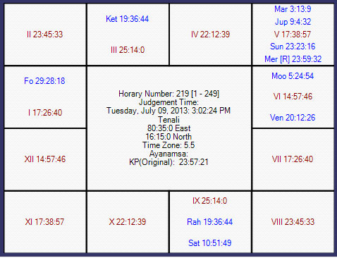 This important match is between India and Sri-Lanka on 09/07/2013 at 13:30 GMT at Kingston. The following is the horary map in favor of India.