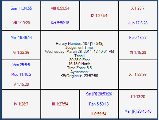 Here, the sub lord of the 6th house is Mercury. He is in 6th house posited in Rahu star and Venus sub. Rahu is in 2nd house, whereas Venus is in 5th house in Mars star. Therefore, Mercury is connected with 1, 2 and 6 houses. It is favorable for RSA. Moon will be in the star of Moon and subs of Rahu and Jupiter. It seems to me that stars are in favor of RSA. Good Luck all!!!