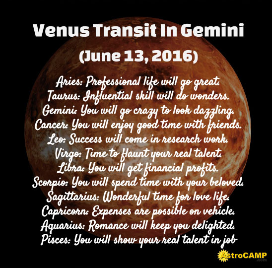 Venus, the planet of luxuries and beauty is transiting in its friend’s zodiac sign, Gemini on June 13, 2016. Are you curious to know what changes this transit will bring in your life? Read our expert's predictions of below.